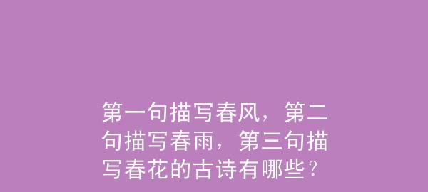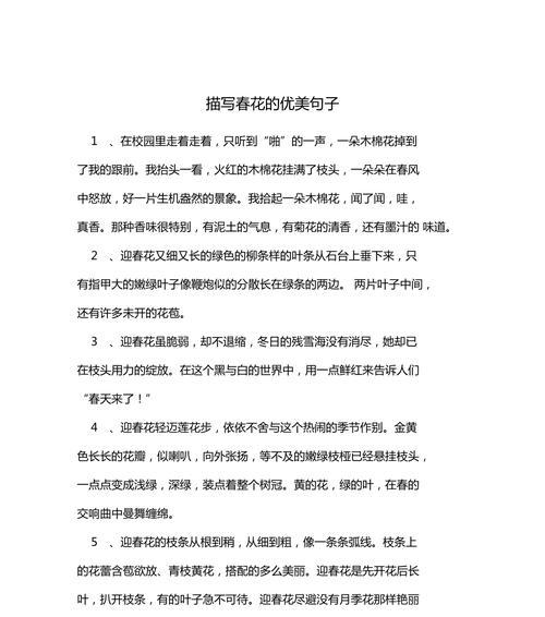 春天是一年四季中最令人期待的季节,春花绽放的景象更是人们瞩目的焦点之一。如何用唯美的语言来描绘这种美丽的画面呢?本文将从诗句中提取出各种绚丽多彩的春花图景,为读者呈现一个美好的春天。